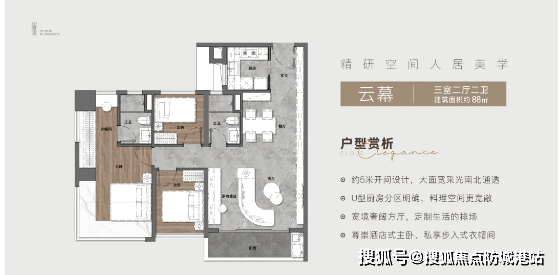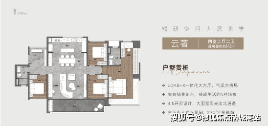 项目规划 5 栋住宅,主打建面约 88-143㎡三房至四房户型,使用率均超 100%。户型融入创新设计,包含可演绎多元场景的 "X 空间",LDKB 一体化方厅实现 5 米起宽阔尺度,主卧配备步入式衣帽间与 270°L 型环幕大飘窗,可开放式 U 型厨房进一步提升空间利用率,带来大平层般的居住体验,首开时热门户型需叫号选房,足见市场认可度。