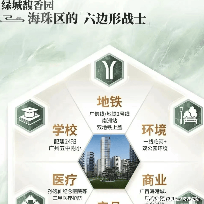 绿城·馥香园位于海珠区原海珠客运站地块,地处海珠湾心,是广州中心区的重要位置。项目3公里范围内汇聚了丰富的市政、商业和医疗资源。市政方面,周边政务服务设施完善,居民办理各类事务便捷高效。商业上,3公里内有百万方商业环绕,小区自带1800㎡风情商业,约1.1公里处有海珠城城光荟,约1.7公里是广州之窗商务港,约1.1公里有广百海港城,约2.5公里可达海珠万达广场等,满足了居民从日常购物到高端消费的各种需求。医疗配套更是优越,约750米处是中山大学孙逸仙纪念医院(三甲),约1.5公里有海珠区妇儿医院,约3.5公里有南方医科大学珠江医院、广州医科大学附属第二医院,为居民的健康提供了坚实保障。
