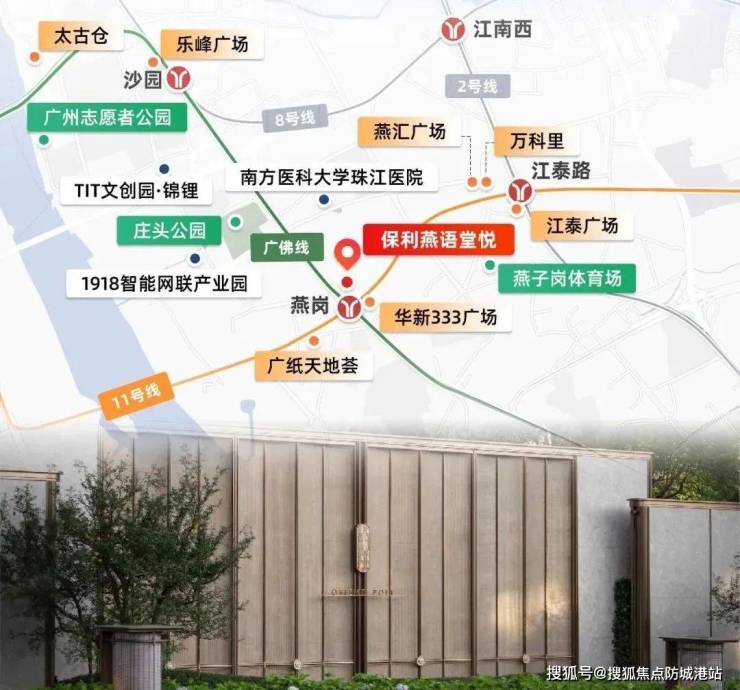 项目坐拥双地铁交汇(燕岗站),包括广佛线和广州首条环线11号线,8站直达琶洲,换乘3号线7站可至珠江新城。此外,自驾出行也十分便捷,紧邻工业大道、昌岗路和内环路,15分钟可达珠江新城,20分钟到达琶洲。