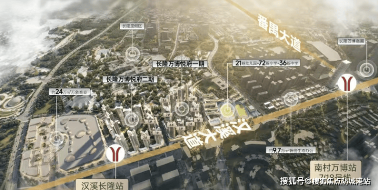 2. **交通畅达**:项目交通优势明显,一期距离地铁3/7号线汉溪长隆站约500米,步行约8分钟,二期下楼就是地铁口,距离地铁18号线南村万博站也不远。此外,广州重磅级的交通线如3号线、7号线、18号线以及广东城际都落点长隆万博,通过这些地铁线路可以快速抵达广州核心区以及大湾区其他城市。项目周边主干道贯穿全城,出门就是汉溪大道,自驾也十分方便,距离全国线路最密集、亚洲最繁忙的高铁站广州南站直线距离仅6公里左右,无论是通勤还是出行旅游都非常便捷。