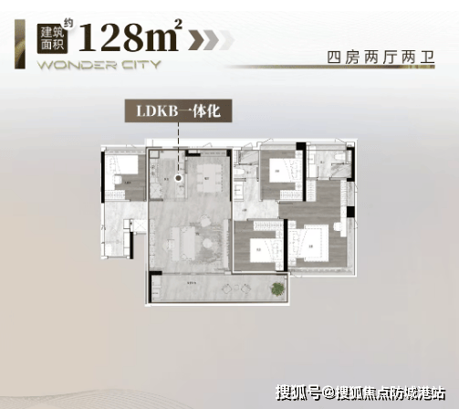 建面约105平方米户型:四房两厅两卫,四开间朝南,LDKB一体化设计,主卧配有270°全景飘窗。