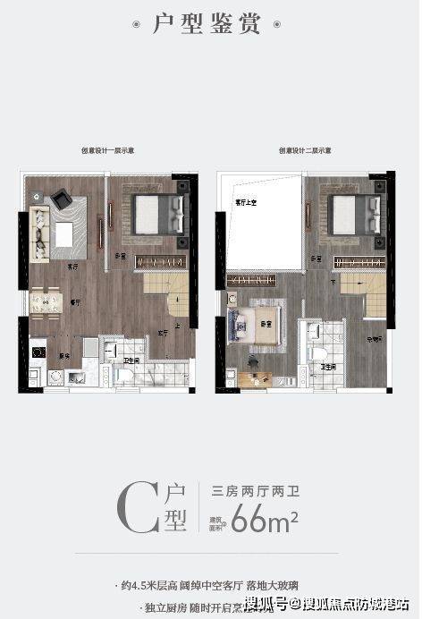 该户型在空间利用上更为灵活与舒适。同样 4.5 米层高,一层设置客厅、餐厅、开放式厨房与一个卫生间,功能齐全。客厅宽敞明亮,270 度环幕窗设计引入充足阳光与开阔视野,营造温馨舒适的起居氛围。二层布局两个卧室与另一个卫生间,双卫生间设计方便家庭成员使用,提升居住便利性。其中一个卧室可根据需求改造成书房或工作室,实现 “居住 + 工作室” 的功能转换,满足不同生活场景,无论是自住还是用于办公,都能完美适配,为追求品质与功能的购房者提供了优质选择。