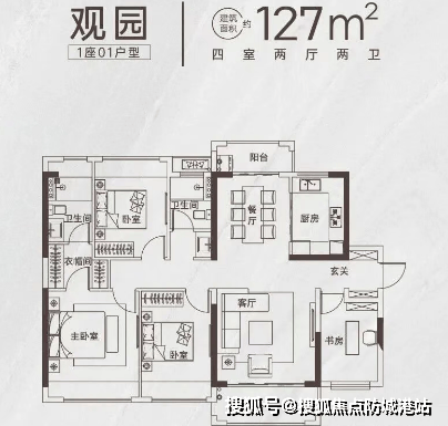 建面约127㎡:正统的南北双阳台设计,四开间朝南,户型方正,居住舒适度高。