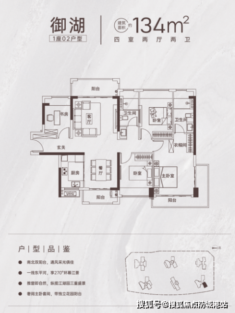 建面约134㎡:南北双阳台设计,其中部分户型享有极佳的望江望公园景观,主卧还配有外飘的转角阳台,设计独特。