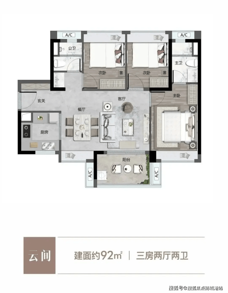 92㎡全南三房两卫:三开间朝南,卧室均带飘窗,采光通透,空间利用率高,总价约228万起,是三口之家的热门之选。