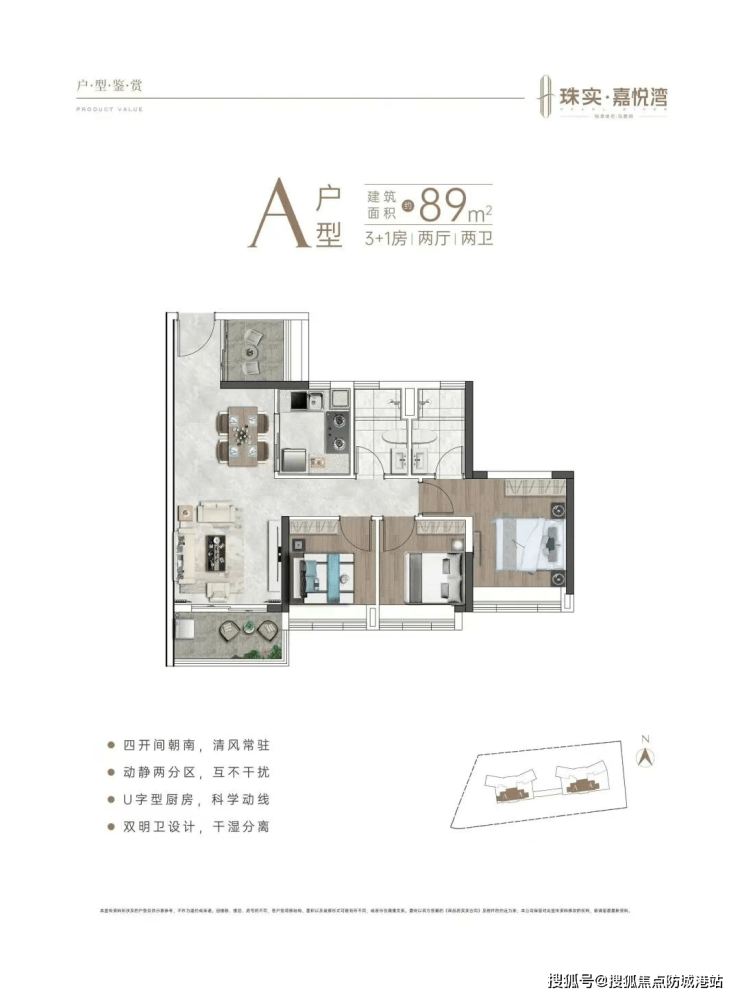 建面约89㎡3+1房|两厅两卫,总价420万起,首付仅需42万即可入手。户型采用四开间朝南设计,清风与阳光贯穿全屋,告别潮湿阴暗;动静分区明确,卧室与客餐厅互不干扰,保障休息私密性;U字型厨房布局,科学规划操作动线,洗菜、切菜、烹饪流程顺畅,提升烹饪效率;双明卫设计,干湿分离,避免潮湿异味,满足多人口家庭日常使用需求。灵动拓展空间可根据需求改造为书房、儿童房或储物间,适配刚需及小家庭改善需求。