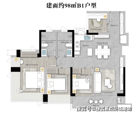 98㎡三房两厅两卫:功能分区明确,空间利用合理。