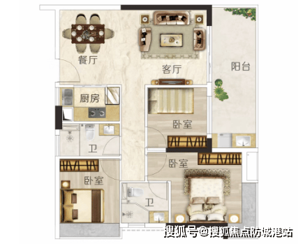 B户型:建面约85m²,2房2厅1卫。户型方正实用,动静分区合理,配备三分离卫生间。