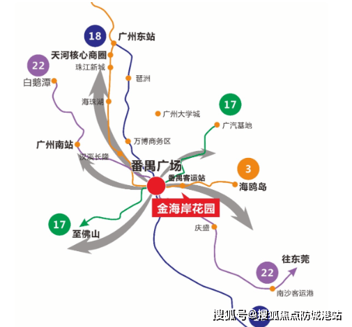 金海岸花园·云起兴泰地处大湾区A字型地理位置顶端,临近沙湾水道,东靠亚运城,是广州未来30年重点发展区域之一。项目雄踞于城市新轴心之上,距离番禺客运站与番禺广场双TOD枢纽中心不远,五条轨道交通线交汇于此(包括3号线、3号线东延线、18号线、22号线、17号线),形成了一横五纵的大动脉交通网络,方便快捷地连接到周边各大商圈和生活设施。
