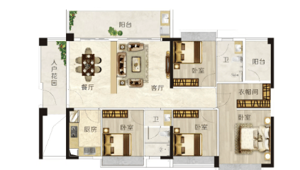 D户型:建面约137m²,4房2厅2卫。超大入户花园设计,提供更多的私人空间和活动场所。