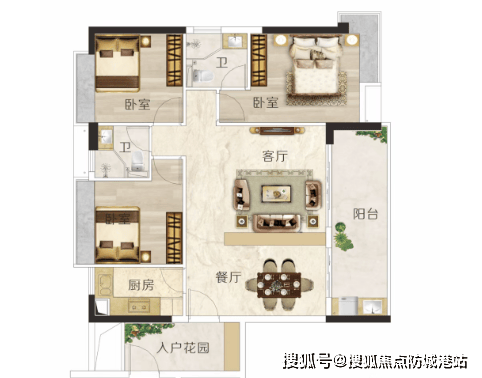 E户型:建面约106m²,3房2厅2卫。阔绰双厅设计,适合作为家庭聚会和娱乐的空间。