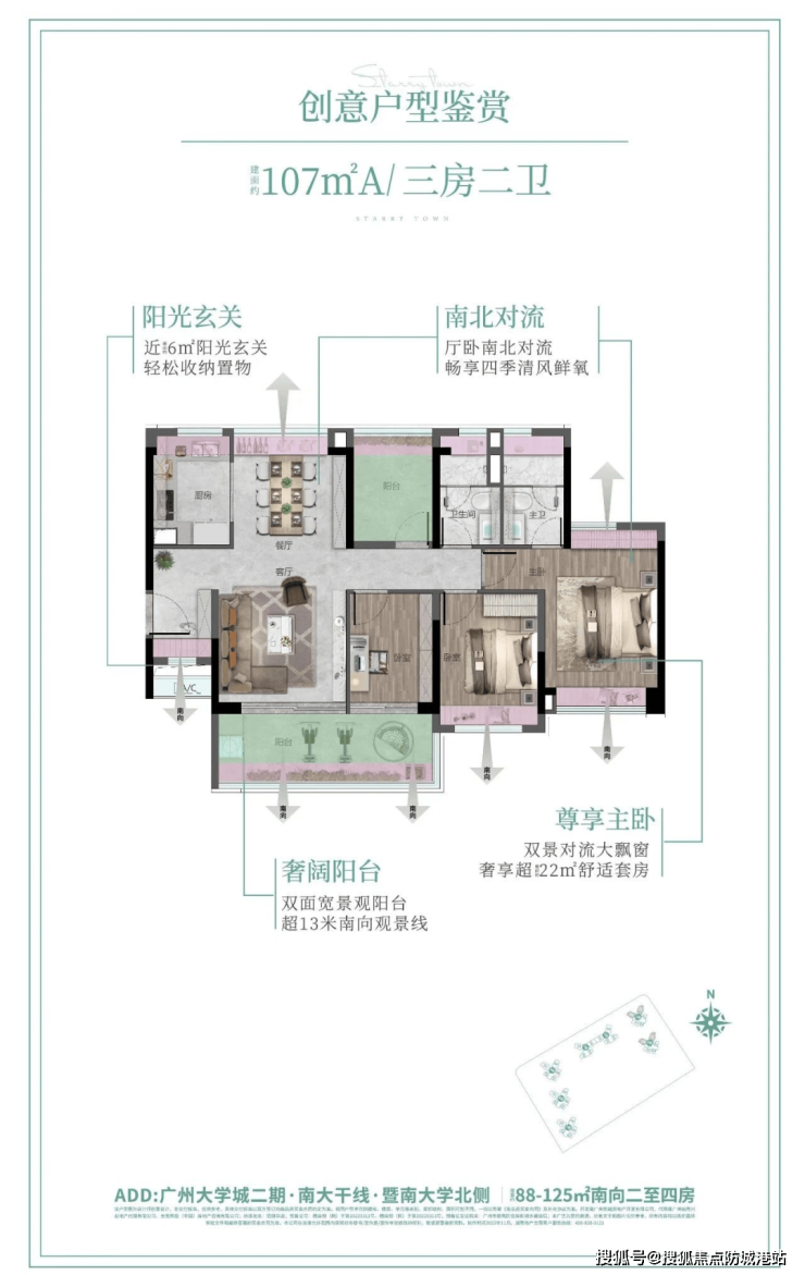 107㎡四房两卫:四开间朝南,6.5米双面宽阳台,主卧独立衣帽间,满足二胎家庭需求,总价约330-360万元;