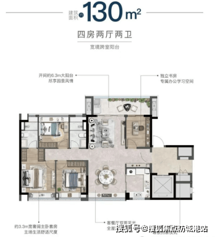 130㎡四房两厅两卫:阔绰电梯前厅,尊崇归家仪式,客餐厅双面采光,全屋南北通透。