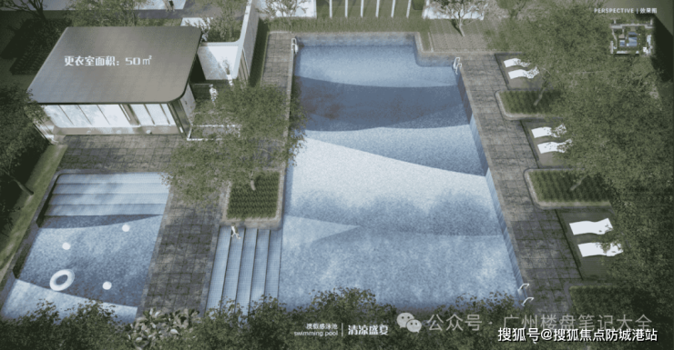 景观泳池——室外度假泳池:约360㎡成人泳池+约60㎡儿童泳池,设置独立更衣室,保障私密性同时兼顾功能性;增设休闲躺椅,提供多元社区休闲交流空间。