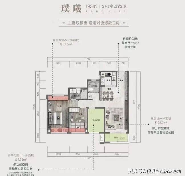 89㎡三房两卫:标配南向4.2米宽景阳台与主卧270°大飘窗,拓展后实际使用面积比同板块竞品多15-20㎡,总价约140万元起。