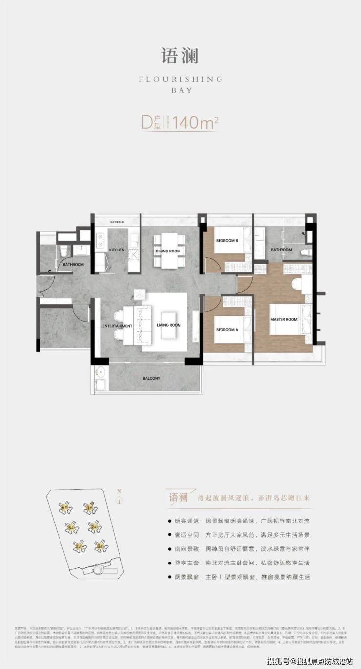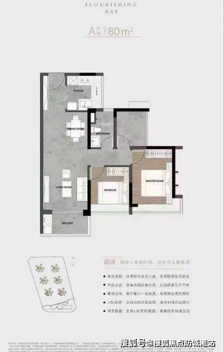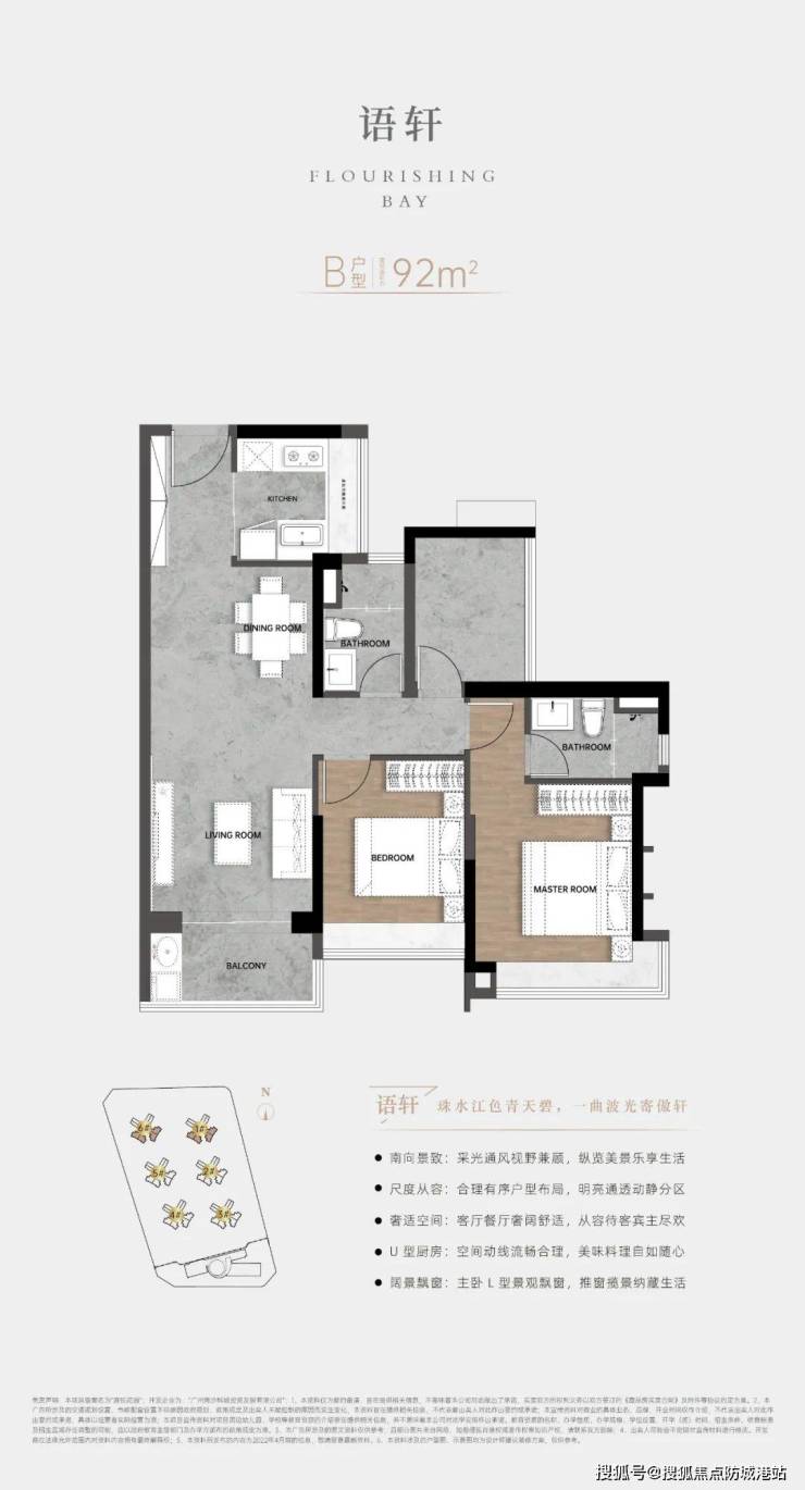 :项目沿江而建,南侧直面珠江口阔景,北侧享滨水景观长廊,拥有海湾风情花园、中央泳池、儿童乐园等休闲设施,营造滨海微度假生活。