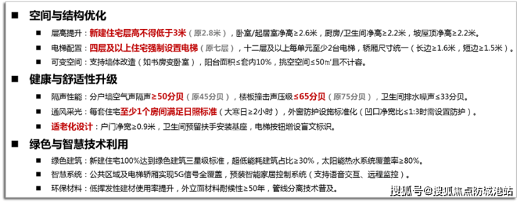 从新发布的《住宅项目规范》可明晰“好房子”的设计指标数据,对比旧版主要从三大方面进行提升:空间与结构优化、健康与舒适性升级、绿色与智慧技术利用。