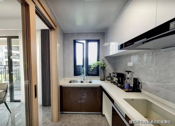 厨房:L型设计,配备有窗户和推拉门,橱柜颜色以黑白色调为主,既实用又美观。