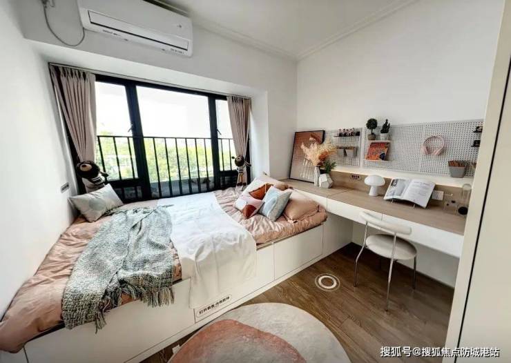 卧室:三间卧室均带有飘窗,主卧为套房设计,采用温暖的米黄色调,并配置了整体落地大衣柜;次卧则采取了一体化设计,将飘窗、床、书桌、衣柜整合在一起,节省了空间。