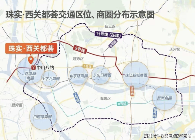 项目交通以“双地铁交汇+立体路网”为核心,通勤效率与出行体验双重提升。距离中山八站TOD仅约500米,该站点汇聚地铁5号线与11号线(已开通),是西部重要的交通枢纽。5号线作为广州东西交通大动脉,串联西关、淘金、珠江新城、金融城等经济核心区,半小时直达珠江新城;11号线作为广州首条环线,串联越秀、荔湾、天河等五区,一线通达白鹅潭、琶洲等全新经济中心及江南西、广州塔等成熟商圈。周边还有34条公交线路汇聚,实现公交、地铁无缝衔接。自驾通过内环A、B线,快速衔接中山路、东风路等主干道,20-40分钟可达白鹅潭、广船、白云新城等重点板块,多维交通网络全方位满足出行需求。