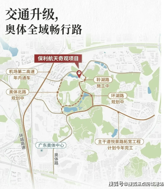 尽管保利辰园湖境距离最近的地铁站——21号线大观路站大约有1.7公里的距离,步行时间较长,但其北侧紧邻智慧城和科学城,与金融城、珠江新城等重要经济区域的车程均不超过半小时,交通便利性较高。随着广州全运会的临近,奥体中心及周边地区的交通设施正在不断升级,例如悦景路拓宽工程的完成将直接连接机场第二高速,聆湖路的规划也将大大缩短业主前往各大商务区的时间,显著改善了出行条件。