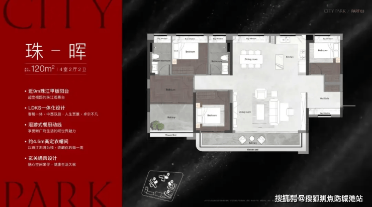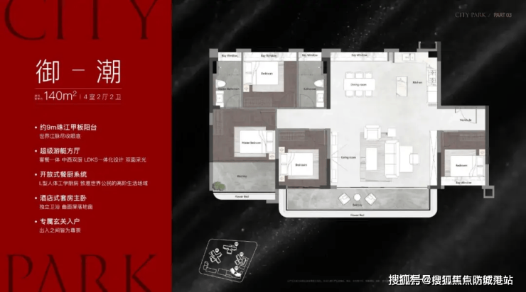 在户型设计方面,项目主打建面 120㎡、140㎡四房两卫户型,满足改善型家庭的居住需求。户型设计遵循 "南北通透、动静分区、全明采光" 的原则,客厅开间达 4.2-4.5 米,主卧开间 3.6-3.8 米,空间宽敞舒适。所有户型均配备全景飘窗和观景阳台,部分高层户型可远眺珠江江景,视野开阔。