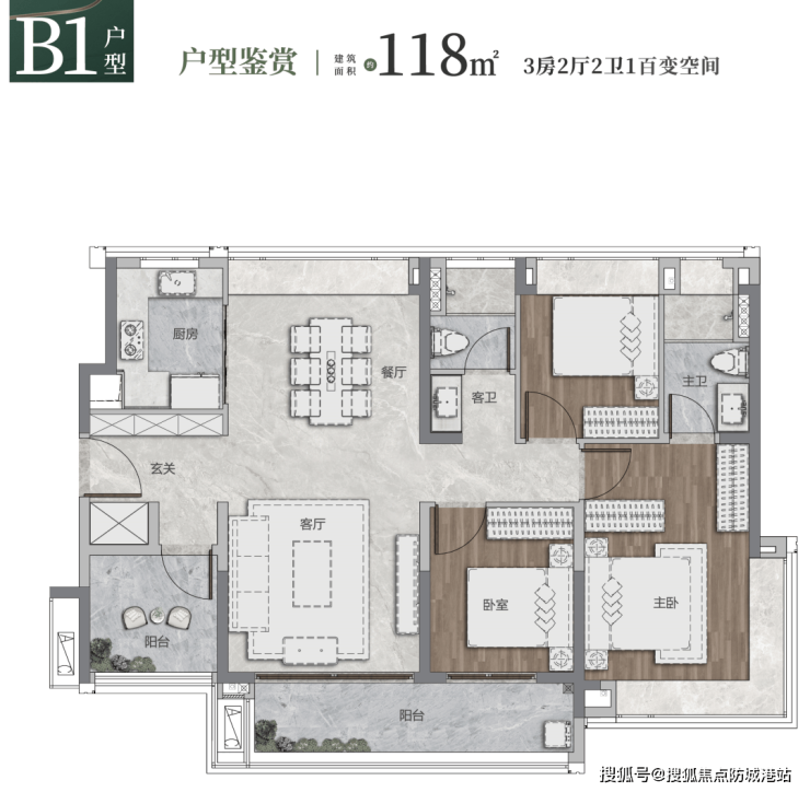 建面约118平方米户型,同样有62套;