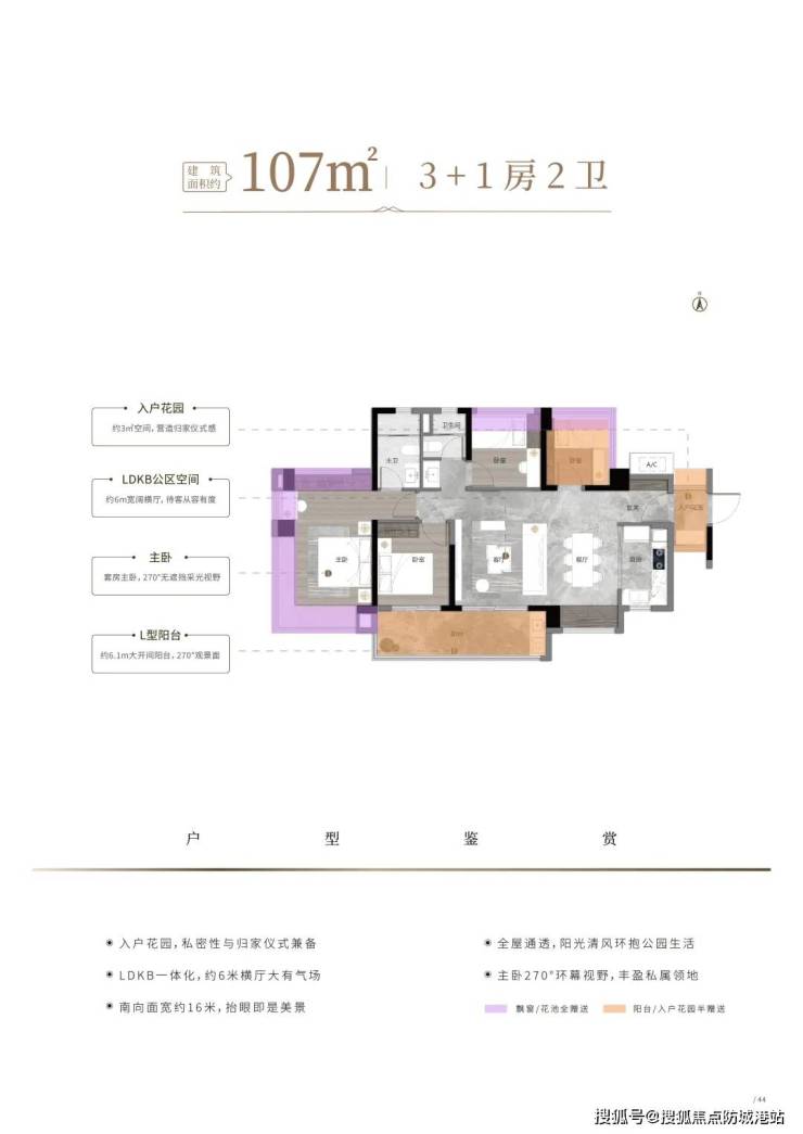 产品:89㎡做到三房两卫,主卧270°转角窗;143㎡四房双主套,得房率85%(含赠送)。