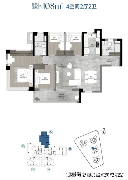 108平米四房两卫:阳台开间达5.95米,客餐厅进深约4.4米,进门即感受到公区的气派。主卧有270°观景窗,无柱设计,观景视野极佳。