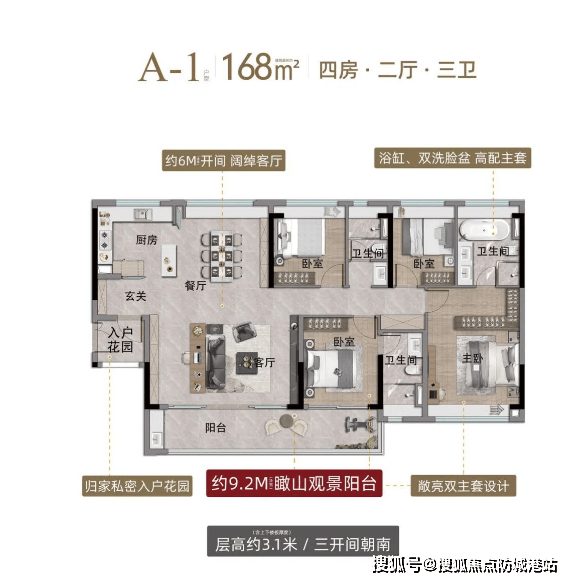 户型面积(㎡)特点实测总价(万元)122㎡三房122双卫设计,主卧套房进深90cm,阳台视野开阔240-260143㎡四房143四开间朝南,双套房配置,客厅面宽7.2米,适配三代同堂330-360