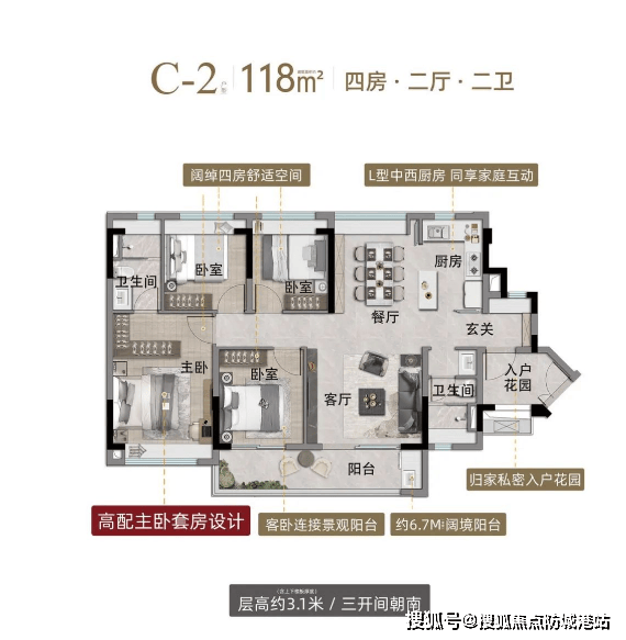 项目主推122-143㎡三至四房,全系无连廊设计,南北通透,层高3米,适配不同家庭结构需求。