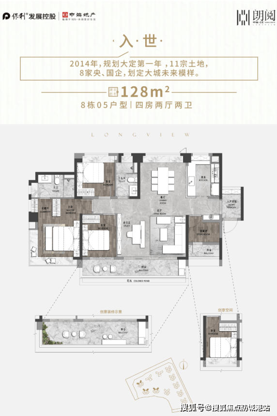 128㎡四房两厅两卫:总价约680万,超8米连通阳台,客厅开间超5米,主卧270°飘窗