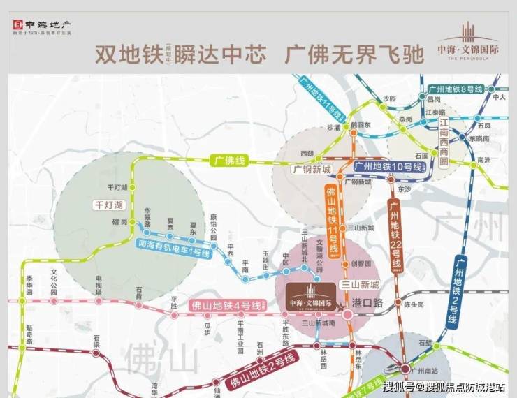 项目拥有双地铁口:地铁11号线以及4号线,佛山11号线(招标中)三站到荔湾广钢新城,5站到海珠区。地铁4号线(在建)一期串联桂城、禅城、三水,二期规划连接番禺,对接广州三号线、二号线。