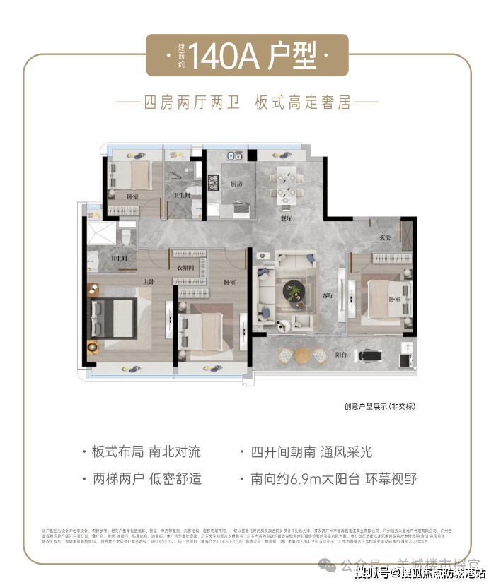 建面约140a㎡高定四房:高层景观视野开阔,板式布局南北对流,全屋精装,酒店式星级居所享受。