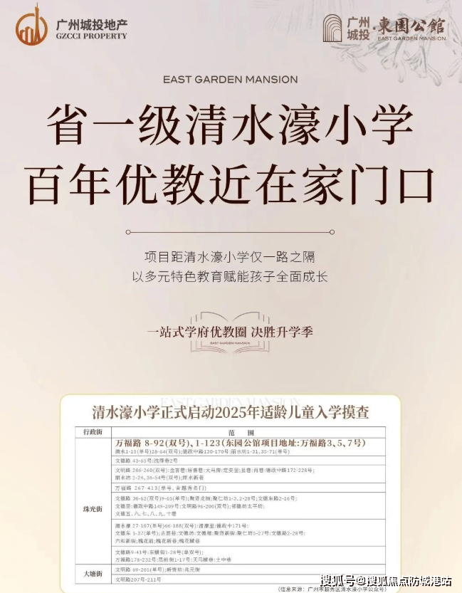 东园公馆的地段学校是清水濠小学,这是一所拥有百年历史的省一级名校。初中则通过越秀区电脑派位,对口中学可能包括省实中学(中山四路校区)、执信中学(水荫路校区)、十六中、培正中学等知名学府。