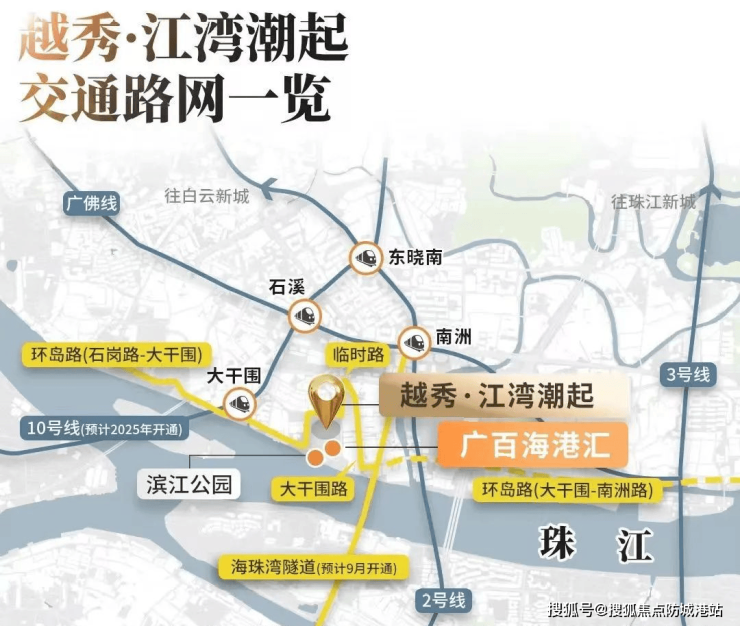 越秀潮起江湾位于广州市海珠区,紧邻珠江后航道,享有稀缺的南向江景资源。该项目距离在建的地铁10号线大干围站仅约650米,预计2025年通车后将极大提升出行便利性。此外,项目周边教育资源丰富,涵盖了从幼儿园到中学的一系列优质学校,满足不同年龄段孩子的教育需求。同时,广百海港城的落成也将为业主带来便捷的高品质生活享受。