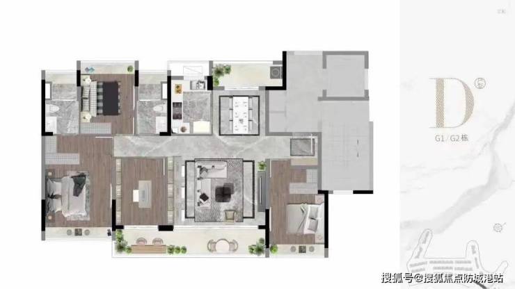 项目洋房一共做了四个户型,每个户型都有不同的优势。例如 A 户型,拥有长达 15 米的 L 型转角阳台,景观面超大,尽显豪宅风范。B 户型的阳台达到了 9.3 米,不仅串联了整个餐客厅,甚至把厨房的生活阳台都联通了,观景面非常开阔。C 户型数量较少,仅在 G4 栋有,五开间望湖,阳台同样长约 9.3 米,两间卧室都设计了弧型观景窗。D 户型阳台稍短,为 8.1 米,但一线临湖,且做了双向阳台,餐客厅联通两个阳台,通透性更强。