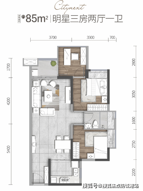 85㎡三房两厅一卫:朝北向,经典紧凑户型,适合小家庭。