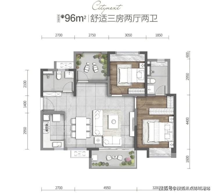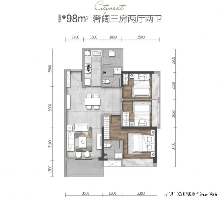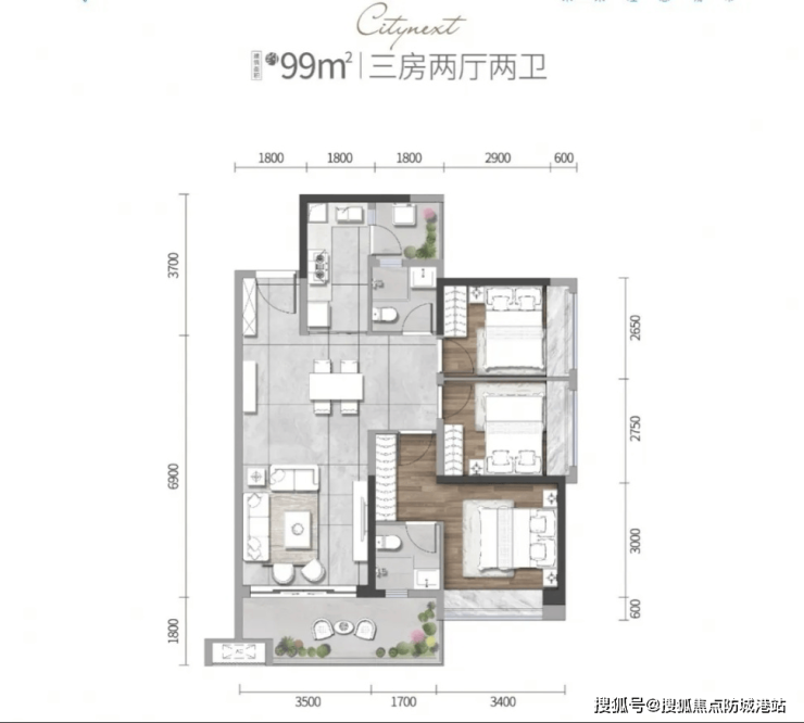 99㎡三房两厅两卫:阔景阳台设计,270度超宽视野南向主卧套房。