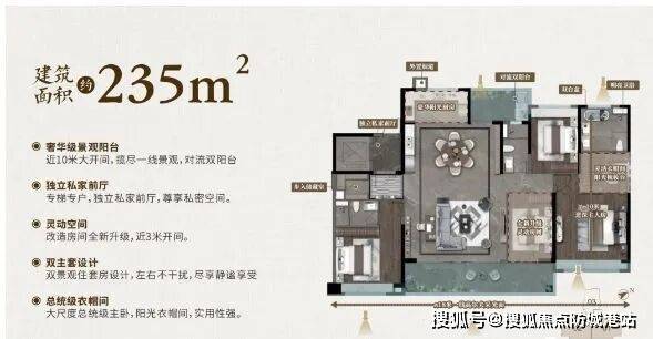 235㎡奢级大平层:产品升级,打造最具尺度感的餐厨客一体空间。超强总统套房级主卧,得房率超高。拥有18米一线高尔夫景观面,推窗即享奢级采光,双主套设计,尽显总统套房级别奢华。