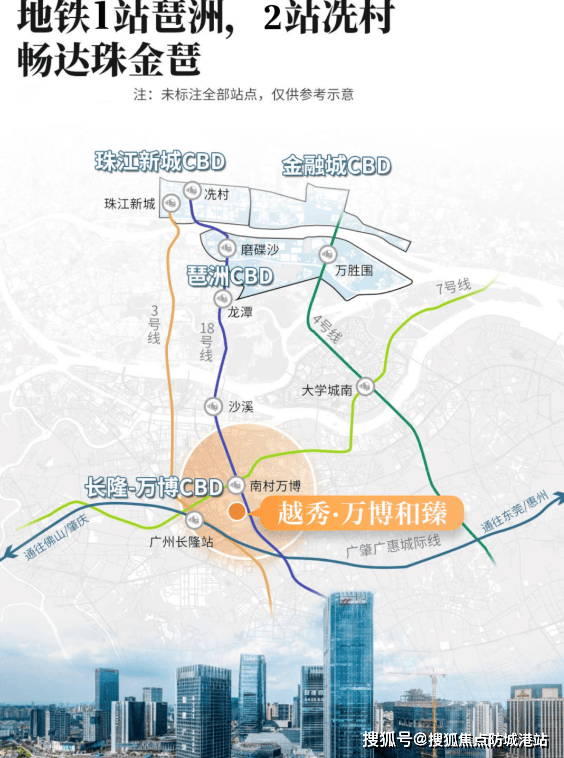 项目位于番禺核心区位,左邻长隆度假区,右靠万博 CBD。首发 CBD 组团更是处于锦绣香江别墅群正中间,与万博商务区直线距离仅约 600 米,对望海印又一城。从 F1 - 2 组团出发,步行至南村万博 E1 口约 1.3 公里,虽距离稍远,但南村万博作为 7 号线及 18 号线的交汇站,可一站直达广州南站、老黄埔、科学城、琶洲、珠江新城等地,交通十分便捷,居民可选择骑行或电动车接驳地铁站,畅达城市各处。