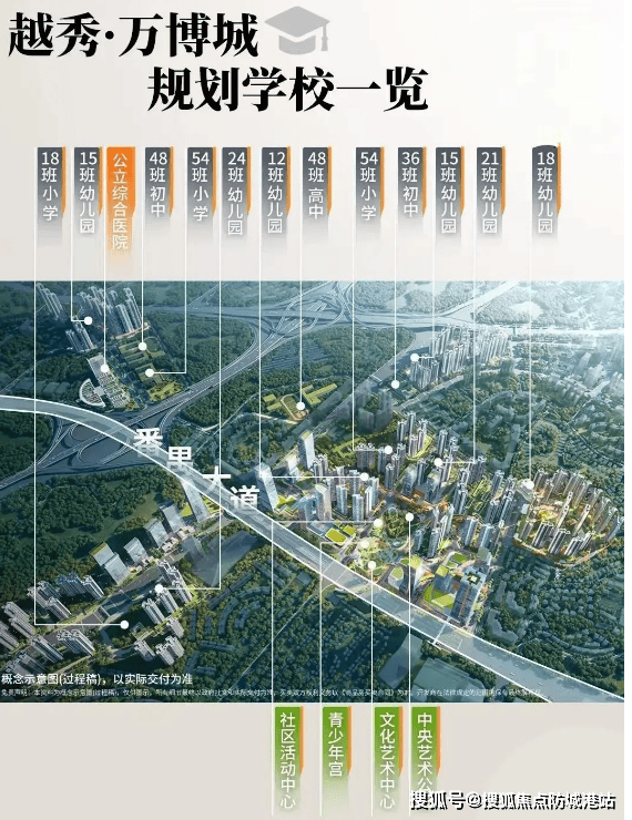 教育上,整个旧改规划 12 所学校,包括 6 所幼儿园、3 所小学、2 所初中、1 所高中。CBD 组团内 54 班小学及 36 班初中已官宣引入番广实验教育集团办学,由广大附中番禺实验学校具体管理,教育质量有保障。商业方面,一路之隔就是万博成熟商务区,天河城、四海城、万达广场、山姆等近在咫尺,项目自身还有约 116 万平商业配套。文化配套上,沿中轴线规划约 5 万平文化设施,包括山体公园等。医疗方面,项目内部配建 6 万平医疗配套,引进优质公立医院。社区内部打造约 7000㎡酒店式会所、五大主题公园、全龄架空层泛会所和约 7.2 万平超级中央园林,生活舒适惬意。
