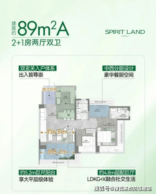 LDKG+X一体化:约4.8米的越级巨厅,将客厅、餐厅、厨房及阳台融为一体,空间感极佳。