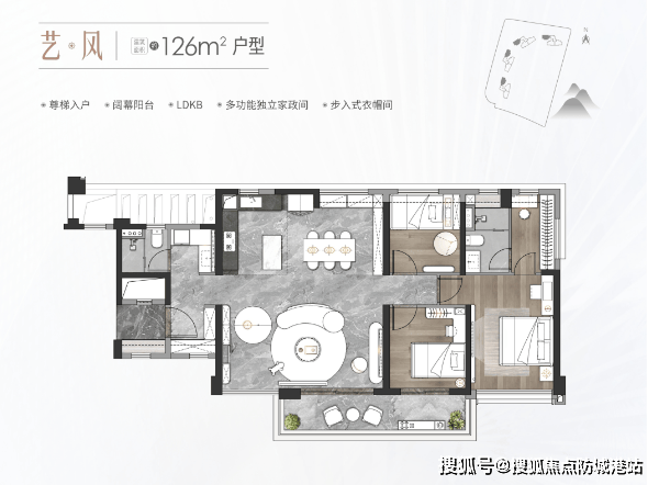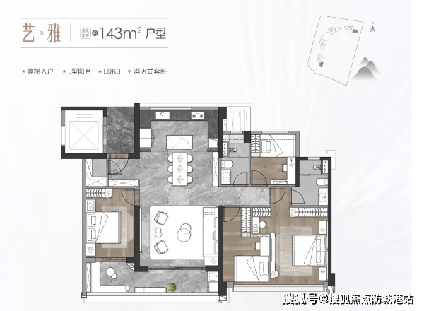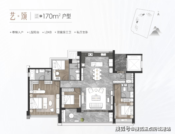125㎡ 五房二卫:双面宽瞰景阳台,三卧室南向瞰山,LDKB客餐厨阳台一体。