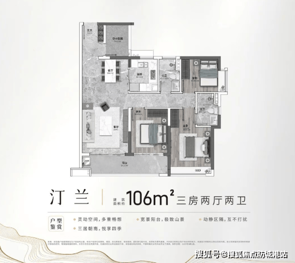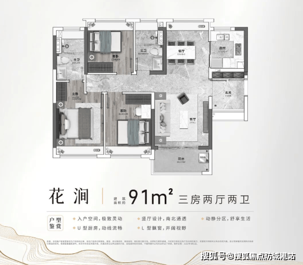 91㎡爆款三房:罕见设置独立入户玄关,提升收纳与隐私;动静分区明确,主卧套房+南北通透,实用率远超市场同类产品。
