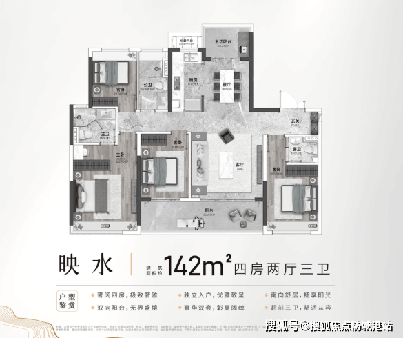 142㎡奢阔四房:四开间朝南,双主卧套房设计,满足多代同堂或二胎家庭对独立空间的需求;约6.7米观景阳台,融山入室。