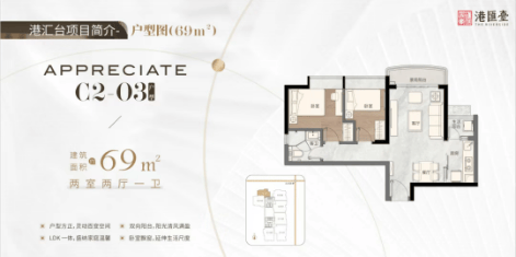 69平方米两房两厅一卫:户型方正,LDK一体设计,双向阳台,全飘窗设计,增加室内利用空间。