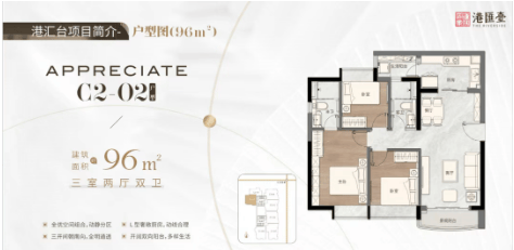96平方米三房两厅两卫:纯南向设计,L型厨房,动静分区,全明通透,双阳台设计,多样生活。