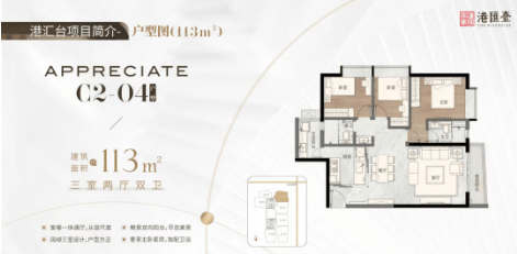113平方米三房两厅两卫:阔绰三室设计,户型方正,采光面广,瞰景双向阳台,奢享主卧套房。