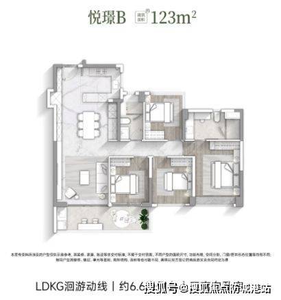 【悦璟B户型 建筑面积约123㎡】:南向卧室、厅卧空间灵活改造、半开放式中西厨、LDKG设计、约6.6米双面宽阳台。